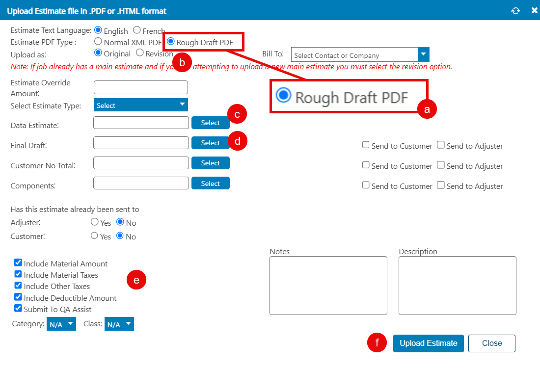 - When uploading to DASH, ensure the "Estimate PDF Type" selection corresponds exactly to the export, meaning you must choose "Rough Draft PDF".