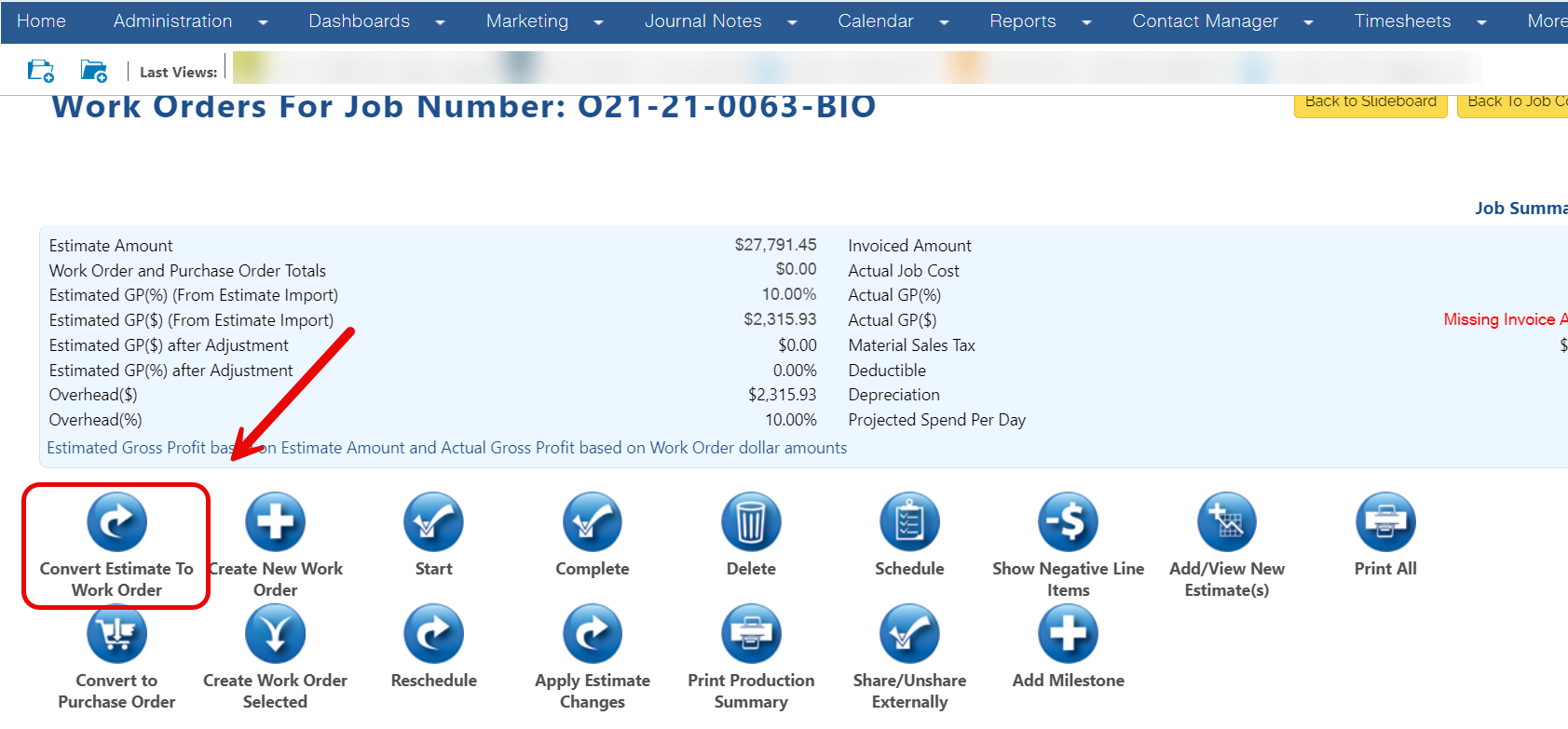 - To convert an Estimate into Work Orders navigate to the Job Slideboard