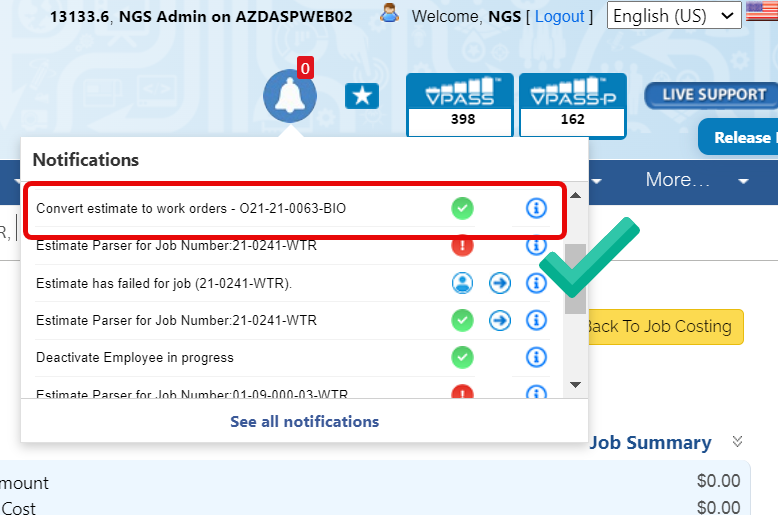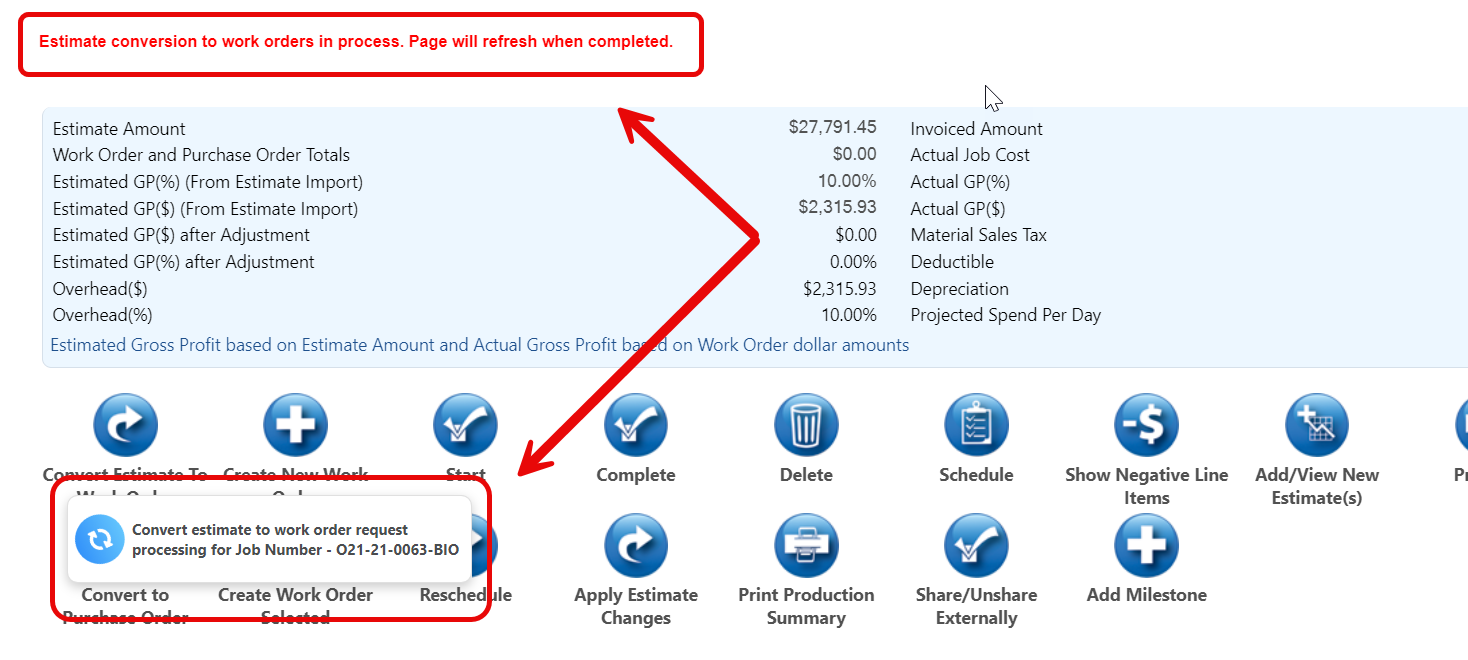 - You'll see notifications of the progress of the conversion in the bottom left of the page. The system will refresh the page once it's done generating Work Orders.