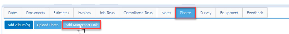 - Select the Photos tab > click the Add Matterport Link button.