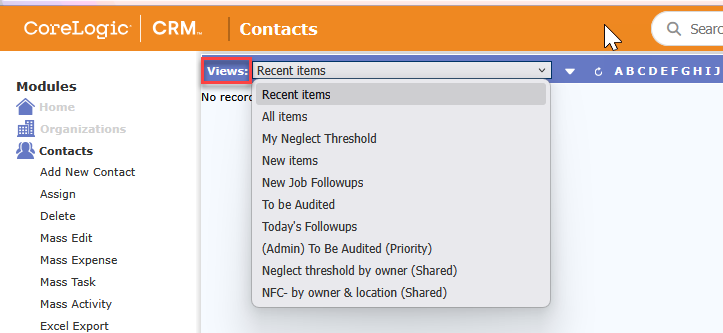 - Select the View you wish to export from the dropdown at the top of the Contacts table.
