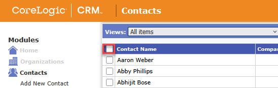 - Once you've selected the View you wish to export, click the All checkbox next to Contact Name or use checkboxes to select specific Contacts.