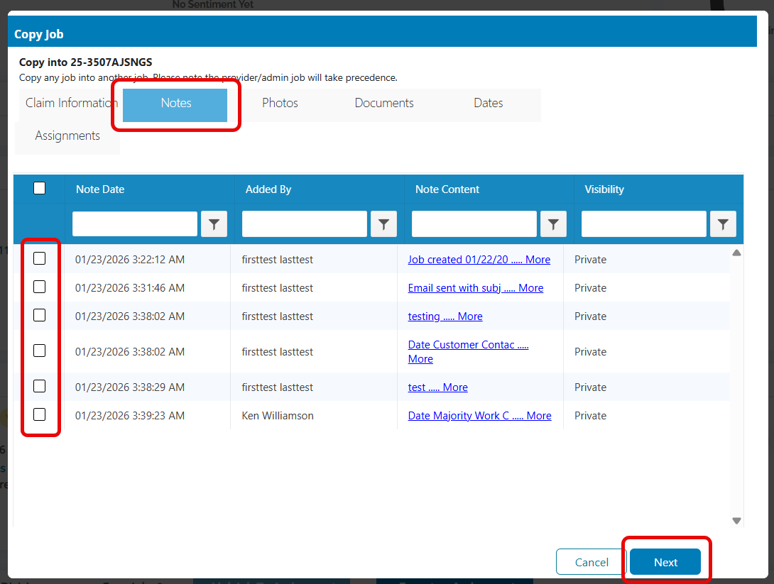 - Select the Notes tab. Check the notes you want to copy to the destination job or select all notes.