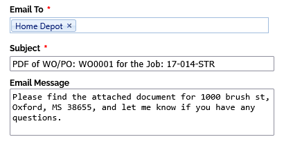- The previously selected Assignee will prepopulate in the Email To field. Add or remove any other contacts you wish to email the work order to. Make sure that the subject line and email message are correct as well.