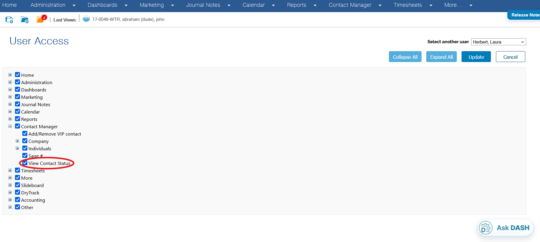 - Expand the "Contact Manager" section and check "View Contact Status"